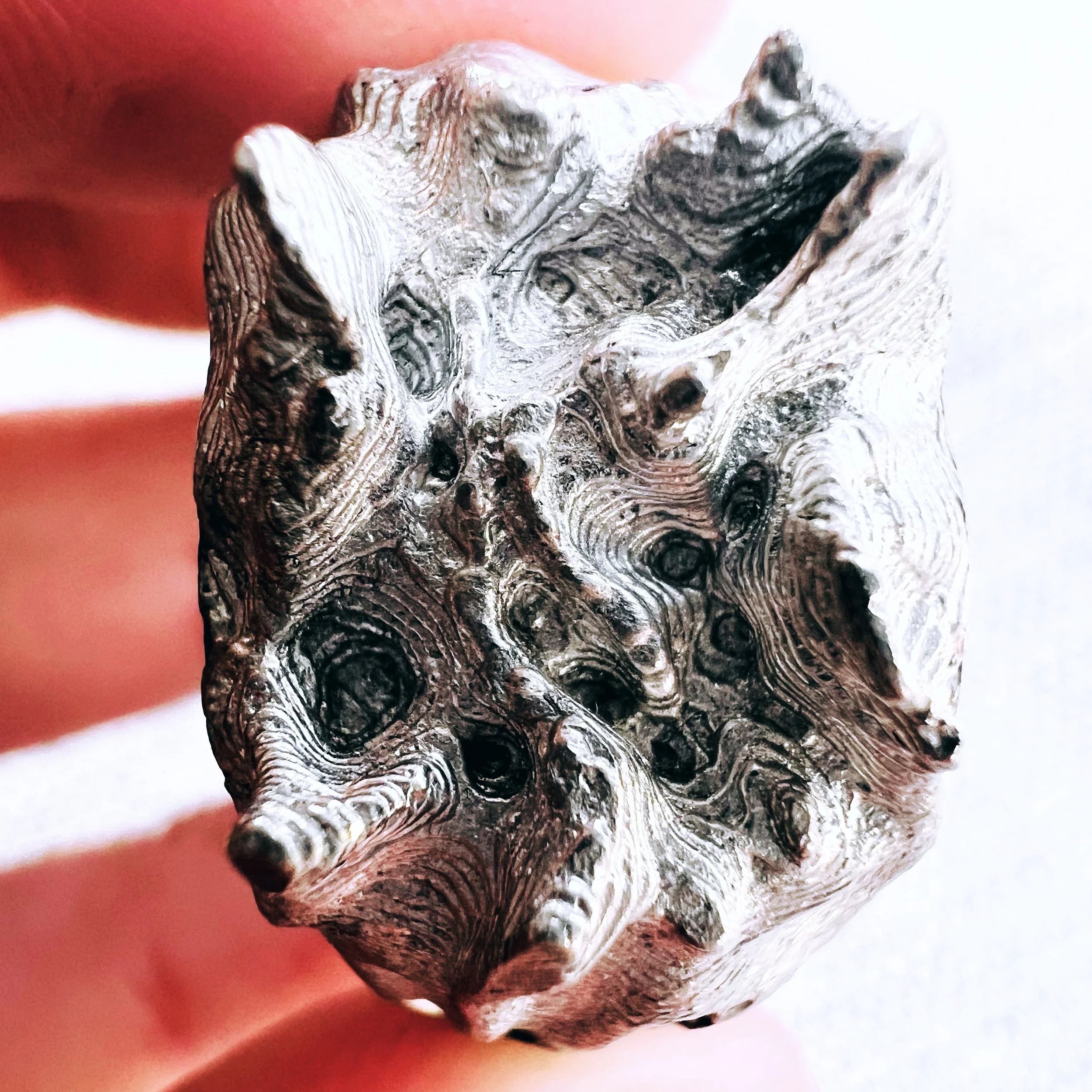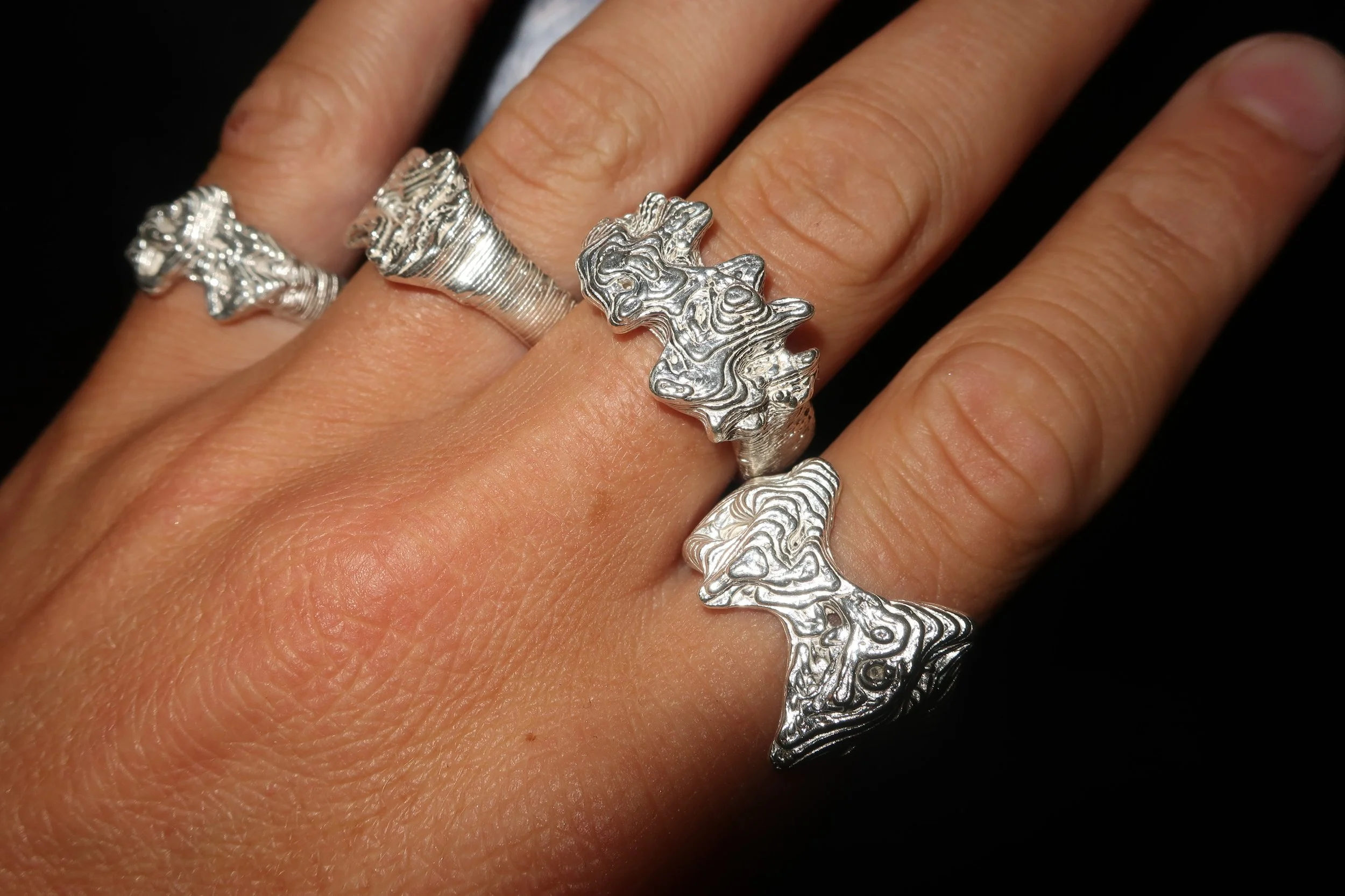 This collection’s digital design and 3D printing process enabled the efficient creation of multiple variations of a single form, embracing subtle adjustments and modifications with ease. This flexibility allowed for the exploration of diverse shapes, textures, and proportions while highlighting the distinctive qualities of glitching and large visible print layers. Each piece maintains a cohesive aesthetic while offering a unique, individualized expression that showcases the imperfections and raw beauty of 3D-printed forms.
